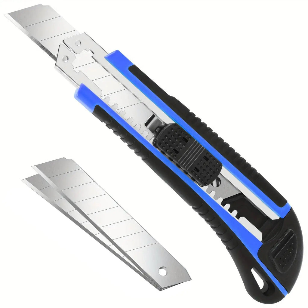 Apresente o E com lâmina de metal afiadíssima, trava segura e compartimento interno com 2 lâminas extras — pronto para qualquer tarefa, em casa ou no trabalho.